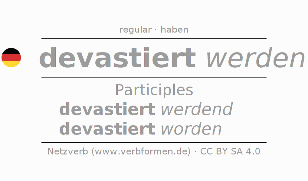 The conjugation of devastieren in Participle Present Perfect part of speech Passive is devastiert werdend, devastiert worden.The conjugation corresponds to certain grammatical rules. Likewise the requirements for the conjugation of the simple verb forms of devastieren in Participle. Comments ☆
