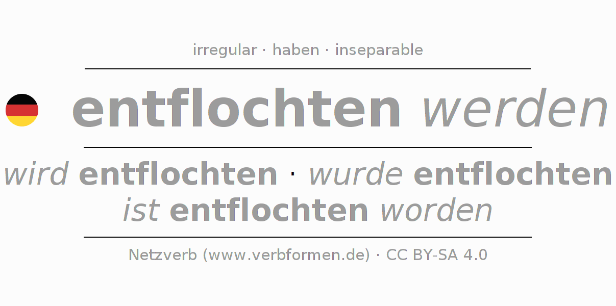 The conjugation of entflechten in Participle Present Perfect part of speech Passive is entflochten werdend, entflochten worden.The conjugation corresponds to certain grammatical rules. Likewise the requirements for the conjugation of the simple verb forms of entflechten in Participle. Comments ☆