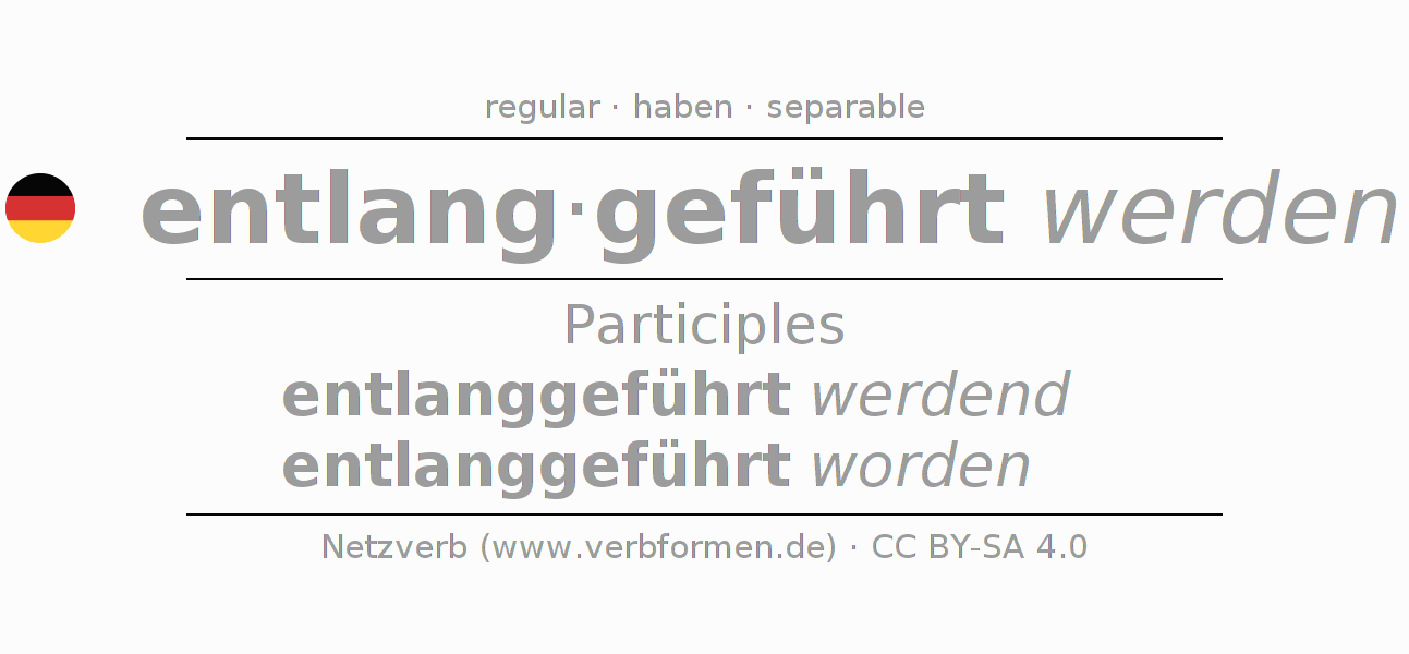 The conjugation of entlangführen in Participle Present Perfect part of speech Passive is entlanggeführt werdend, entlanggeführt worden.The conjugation corresponds to certain grammatical rules. Likewise the requirements for the conjugation of the simple verb forms of entlangführen in Participle. Comments ☆