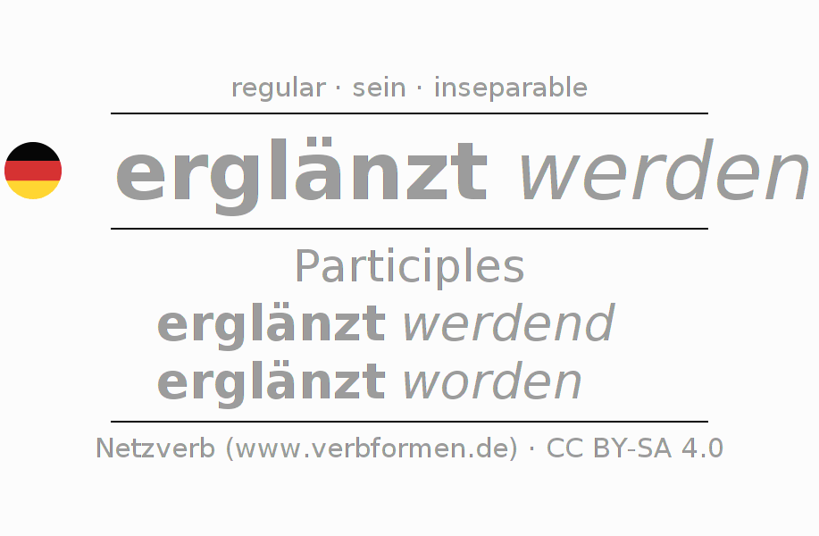 The conjugation of erglänzen in Participle Present Perfect part of speech Passive is erglänzt werdend, erglänzt worden.The conjugation corresponds to certain grammatical rules. Likewise the requirements for the conjugation of the simple verb forms of erglänzen in Participle. Comments ☆