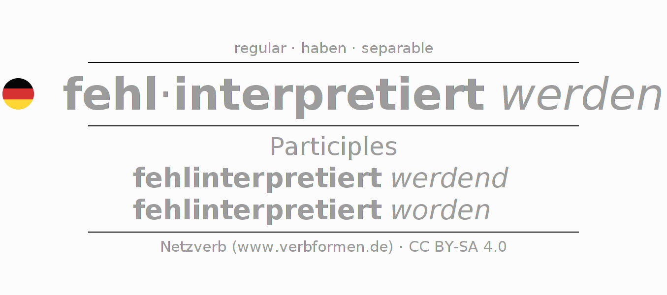 The conjugation of fehlinterpretieren in Participle Present Perfect part of speech Passive is fehlinterpretiert werdend, fehlinterpretiert worden.The conjugation corresponds to certain grammatical rules. Likewise the requirements for the conjugation of the simple verb forms of fehlinterpretieren in Participle. Comments ☆