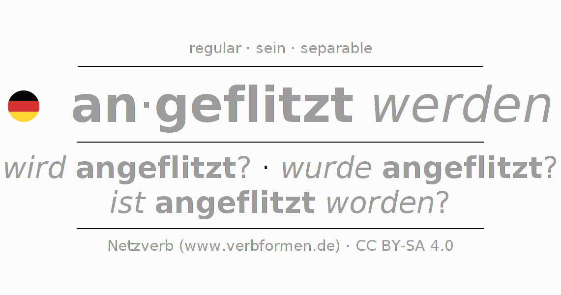 The conjugation of anflitzen in Participle Present Perfect part of speech Passive is angeflitzt werdend, angeflitzt worden.The conjugation corresponds to certain grammatical rules. Likewise the requirements for the conjugation of the simple verb forms of anflitzen in Participle. Comments ☆