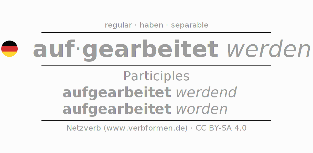 The conjugation of aufarbeiten in Participle Present Perfect part of speech Passive is aufgearbeitet werdend, aufgearbeitet worden.The conjugation corresponds to certain grammatical rules. Likewise the requirements for the conjugation of the simple verb forms of aufarbeiten in Participle. Comments ☆