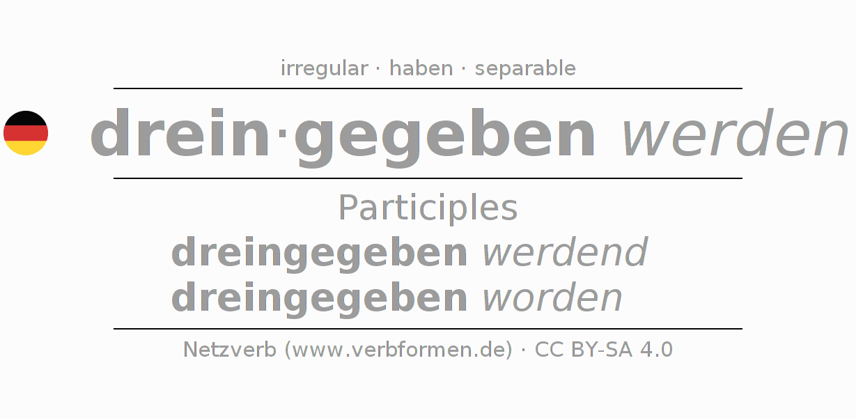 The conjugation of dreingeben in Participle Present Perfect part of speech Passive is dreingegeben werdend, dreingegeben worden.The conjugation corresponds to certain grammatical rules. Likewise the requirements for the conjugation of the simple verb forms of dreingeben in Participle. Comments ☆