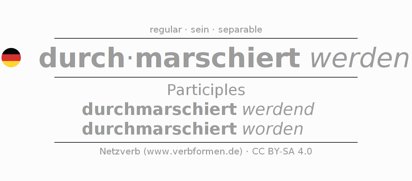 The conjugation of durchmarschieren in Participle Present Perfect part of speech Passive is durchmarschiert werdend, durchmarschiert worden.The conjugation corresponds to certain grammatical rules. Likewise the requirements for the conjugation of the simple verb forms of durchmarschieren in Participle. Comments ☆