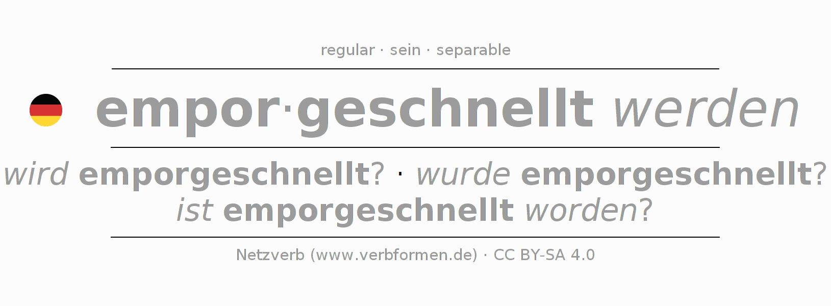 The conjugation of emporschnellen in Participle Present Perfect part of speech Passive is emporgeschnellt werdend, emporgeschnellt worden.The conjugation corresponds to certain grammatical rules. Likewise the requirements for the conjugation of the simple verb forms of emporschnellen in Participle. Comments ☆