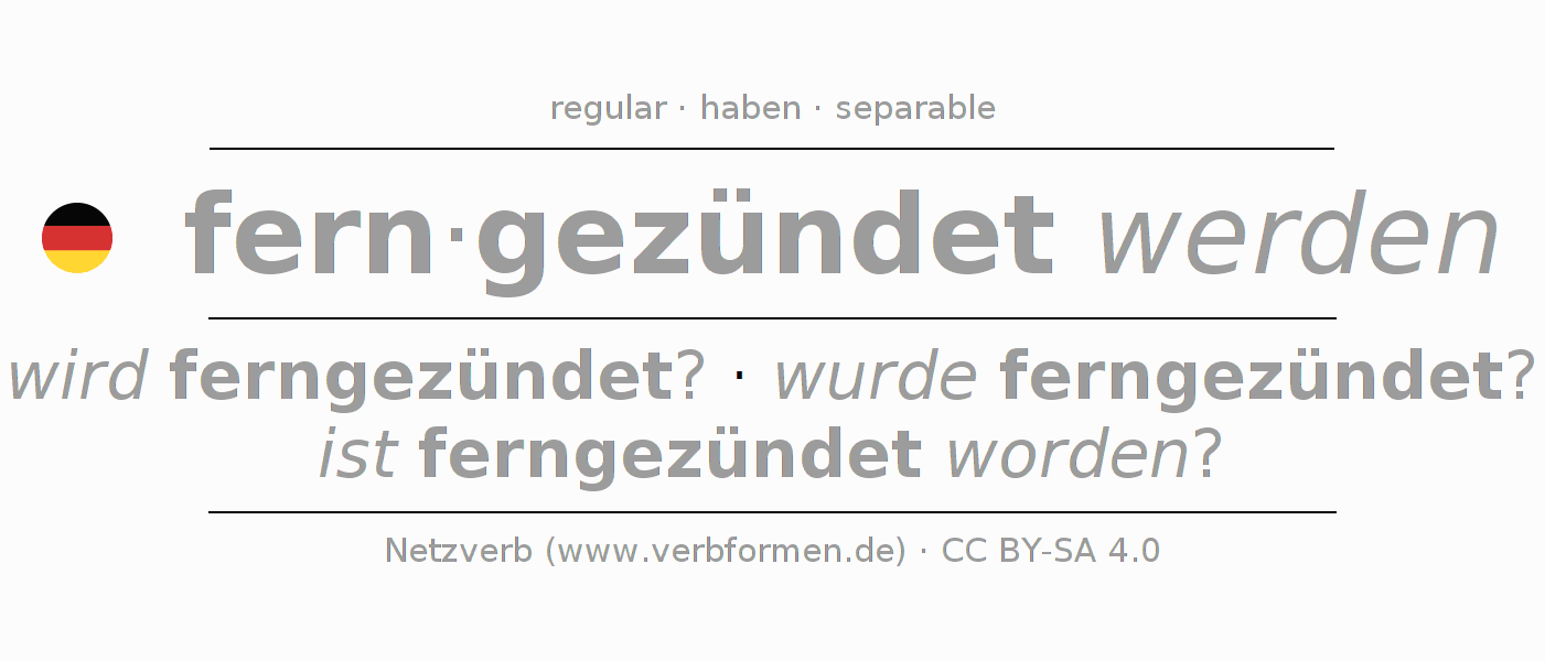 The conjugation of fernzünden in Participle Present Perfect part of speech Passive is ferngezündet werdend, ferngezündet worden.The conjugation corresponds to certain grammatical rules. Likewise the requirements for the conjugation of the simple verb forms of fernzünden in Participle. Comments ☆
