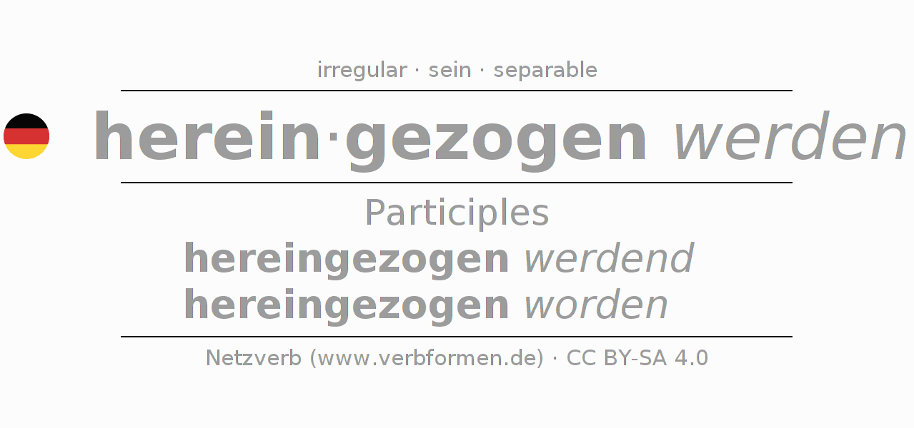The conjugation of hereinziehen in Participle Present Perfect part of speech Passive is hereingezogen werdend, hereingezogen worden.The conjugation corresponds to certain grammatical rules. Likewise the requirements for the conjugation of the simple verb forms of hereinziehen in Participle. Comments ☆