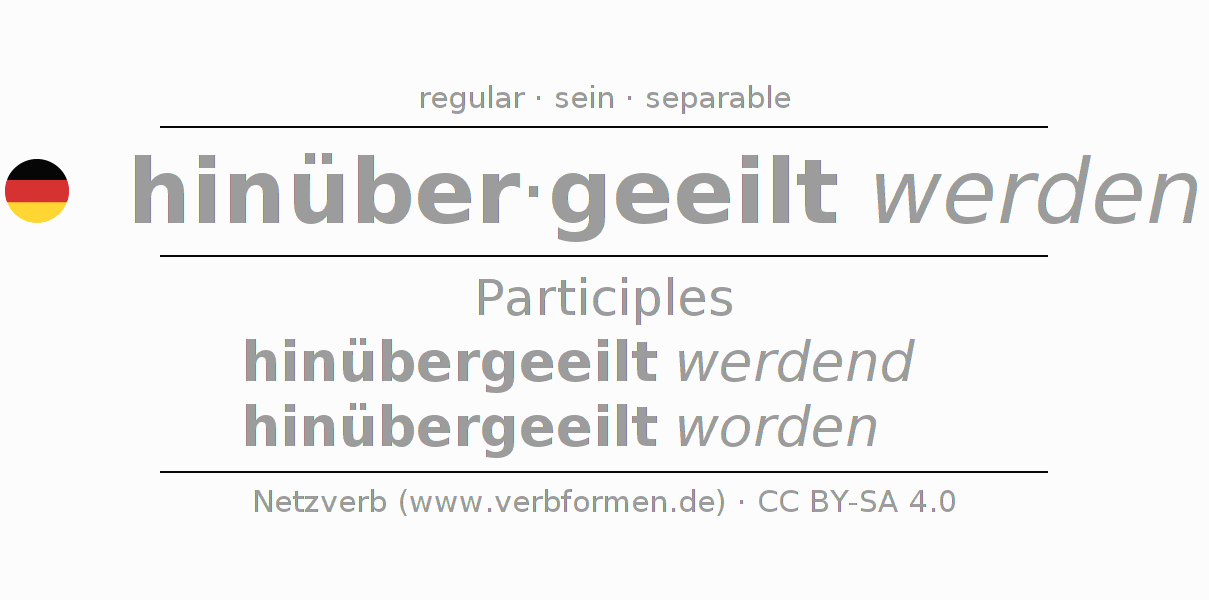 The verb hinübereilen fully conjugated in all persons and numbers in the Participle Present Perfect