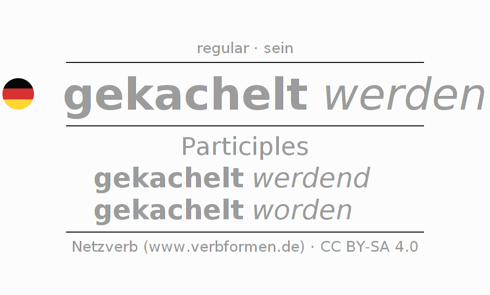 The conjugation of kacheln in Participle Present Perfect part of speech Passive is gekachelt werdend, gekachelt worden.The conjugation corresponds to certain grammatical rules. Likewise the requirements for the conjugation of the simple verb forms of kacheln in Participle. Comments ☆