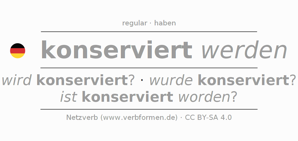 The conjugation of konservieren in Participle Present Perfect part of speech Passive is konserviert werdend, konserviert worden.The conjugation corresponds to certain grammatical rules. Likewise the requirements for the conjugation of the simple verb forms of konservieren in Participle. Comments ☆