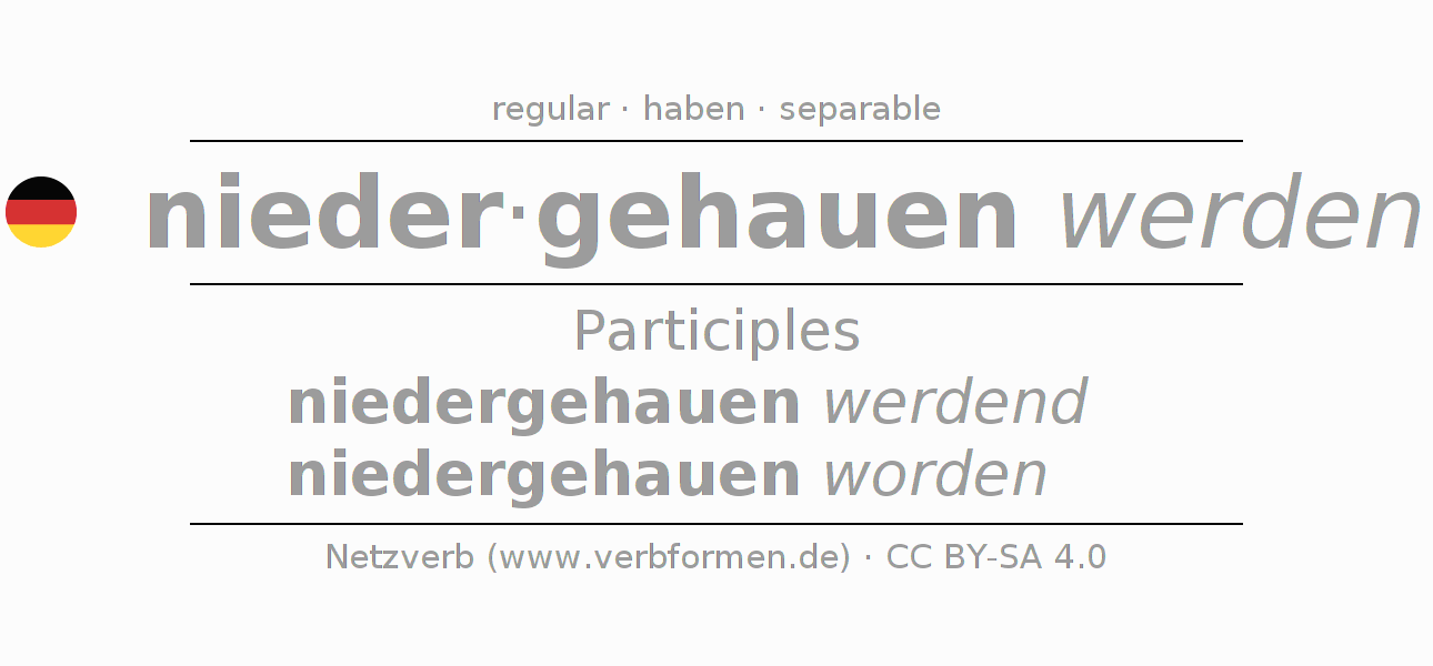 The conjugation of niederhauen in Participle Present Perfect part of speech Passive is niedergehau(e)n werdend, niedergehau(e)n worden.The conjugation corresponds to certain grammatical rules. Likewise the requirements for the conjugation of the simple verb forms of niederhauen in Participle. Comments ☆