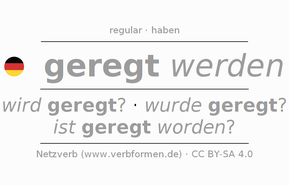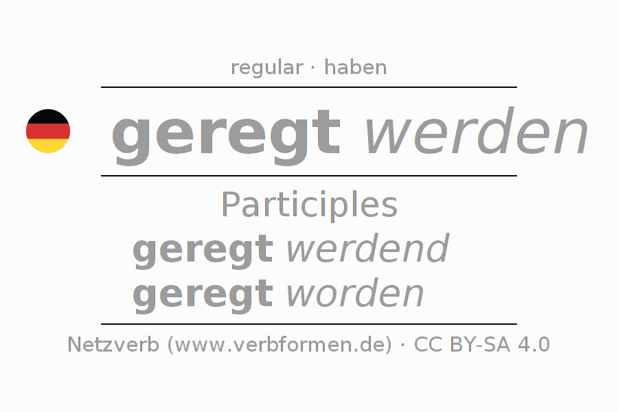 The conjugation of regen in Participle Present Perfect part of speech Passive is geregt werdend, geregt worden.The conjugation corresponds to certain grammatical rules. Likewise the requirements for the conjugation of the simple verb forms of regen in Participle. Comments ☆