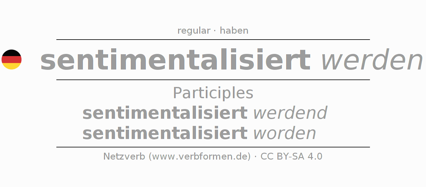 The conjugation of sentimentalisieren in Participle Present Perfect part of speech Passive is sentimentalisiert werdend, sentimentalisiert worden.The conjugation corresponds to certain grammatical rules. Likewise the requirements for the conjugation of the simple verb forms of sentimentalisieren in Participle. Comments ☆