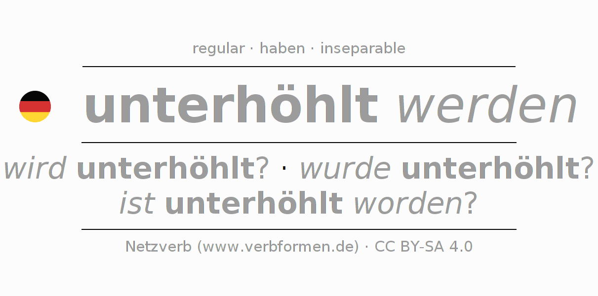 The conjugation of unterhöhlen in Participle Present Perfect part of speech Passive is unterhöhlt werdend, unterhöhlt worden.The conjugation corresponds to certain grammatical rules. Likewise the requirements for the conjugation of the simple verb forms of unterhöhlen in Participle. Comments ☆