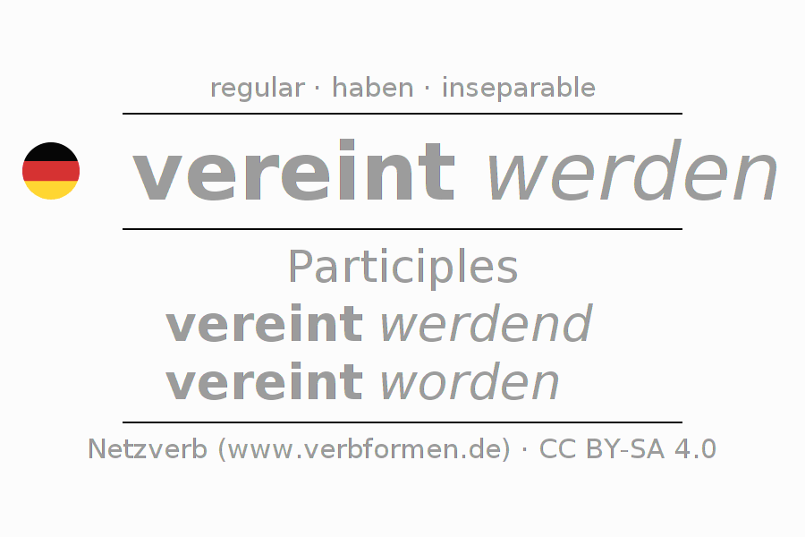 The conjugation of vereinen in Participle Present Perfect part of speech Passive is vereint werdend, vereint worden.The conjugation corresponds to certain grammatical rules. Likewise the requirements for the conjugation of the simple verb forms of vereinen in Participle. Comments ☆