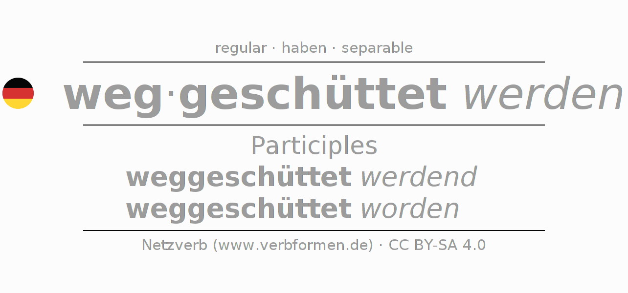 The conjugation of wegschütten in Participle Present Perfect part of speech Passive is weggeschüttet werdend, weggeschüttet worden.The conjugation corresponds to certain grammatical rules. Likewise the requirements for the conjugation of the simple verb forms of wegschütten in Participle. Comments ☆