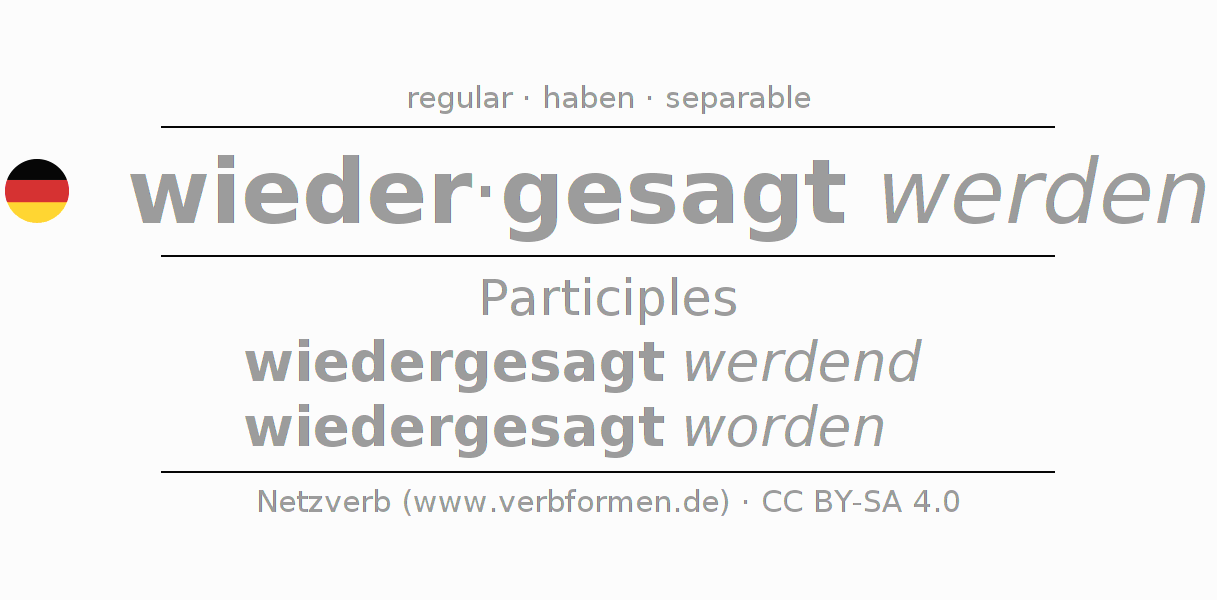 The conjugation of wiedersagen in Participle Present Perfect part of speech Passive is wiedergesagt werdend, wiedergesagt worden.The conjugation corresponds to certain grammatical rules. Likewise the requirements for the conjugation of the simple verb forms of wiedersagen in Participle. Comments ☆