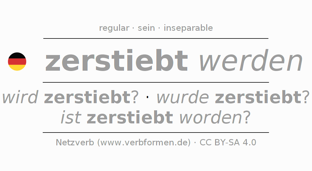The conjugation of zerstieben in Participle Present Perfect part of speech Passive is zerstiebt werdend, zerstiebt worden.The conjugation corresponds to certain grammatical rules. Likewise the requirements for the conjugation of the simple verb forms of zerstieben in Participle. Comments ☆