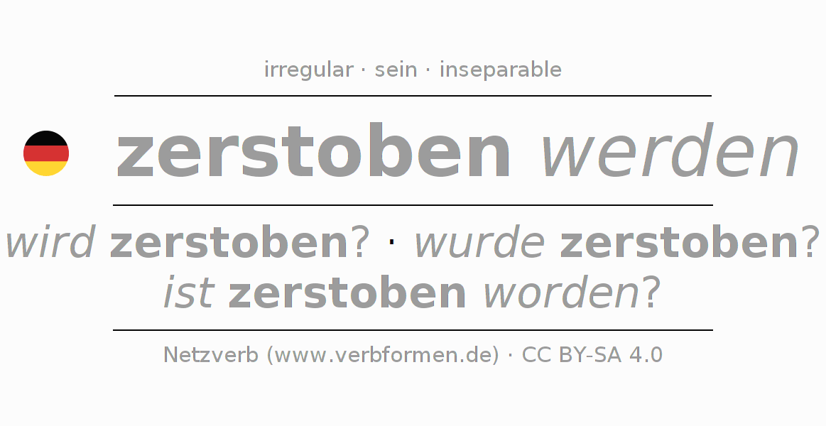 The conjugation of zerstieben in Participle Present Perfect part of speech Passive is zerstoben werdend, zerstoben worden.The conjugation corresponds to certain grammatical rules. Likewise the requirements for the conjugation of the simple verb forms of zerstieben in Participle. Comments ☆