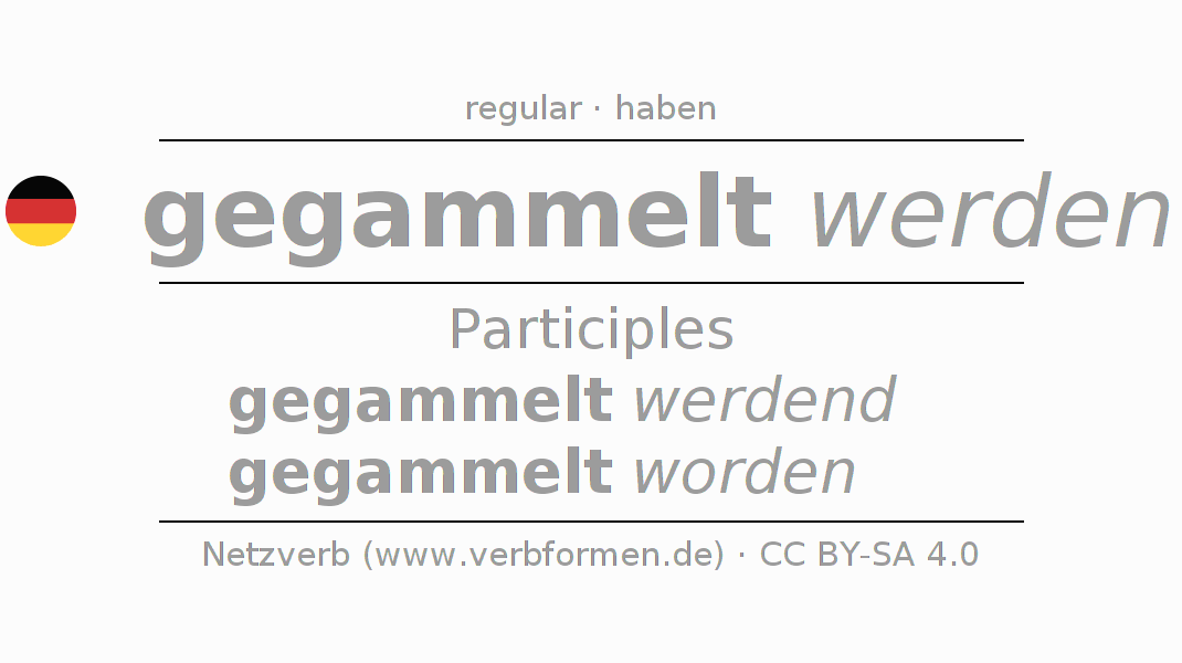 The conjugation of gammeln in Participle Present Perfect part of speech Passive is gegammelt werdend, gegammelt worden.The conjugation corresponds to certain grammatical rules. Likewise the requirements for the conjugation of the simple verb forms of gammeln in Participle. Comments ☆