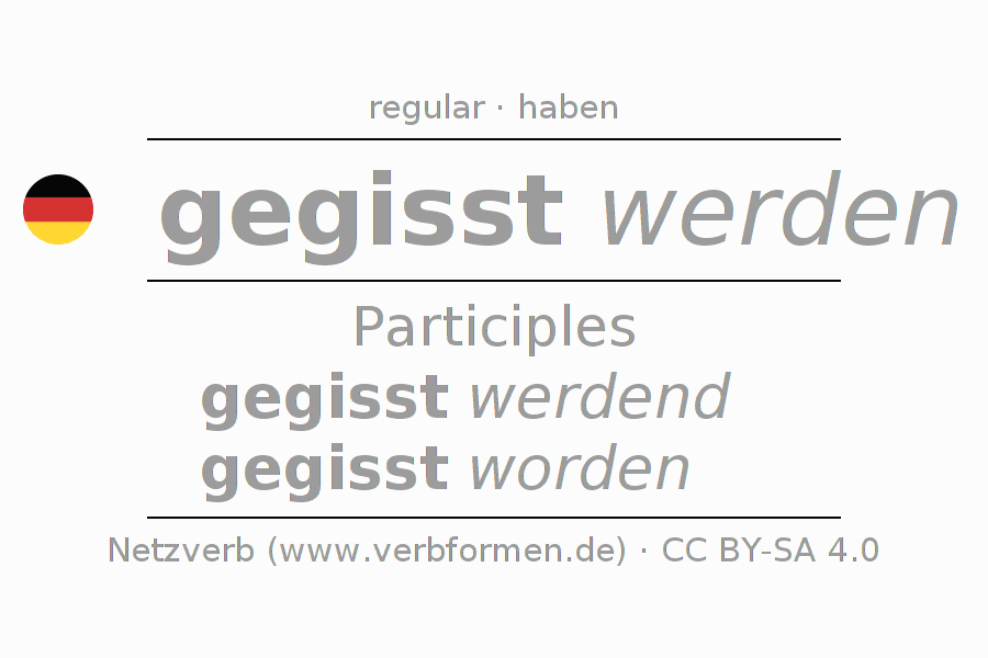 The conjugation of gissen in Participle Present Perfect part of speech Passive is gegisst werdend, gegisst worden.The conjugation corresponds to certain grammatical rules. Likewise the requirements for the conjugation of the simple verb forms of gissen in Participle. Comments ☆