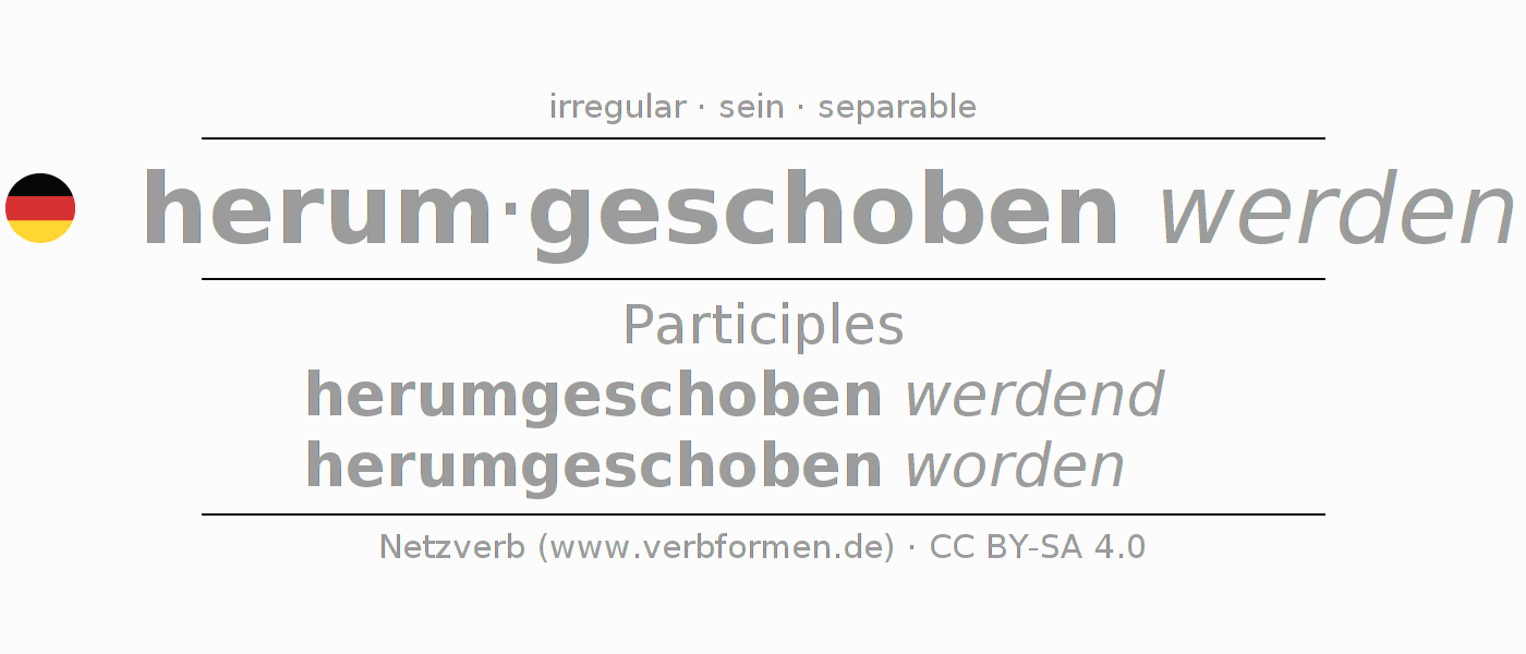 The conjugation of herumschieben in Participle Present Perfect part of speech Passive is herumgeschoben werdend, herumgeschoben worden.The conjugation corresponds to certain grammatical rules. Likewise the requirements for the conjugation of the simple verb forms of herumschieben in Participle. Comments ☆