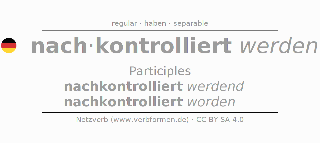 The conjugation of nachkontrollieren in Participle Present Perfect part of speech Passive is nachkontrolliert werdend, nachkontrolliert worden.The conjugation corresponds to certain grammatical rules. Likewise the requirements for the conjugation of the simple verb forms of nachkontrollieren in Participle. Comments ☆