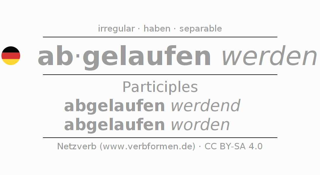 The conjugation of ablaufen in Participle Present Perfect part of speech Passive is abgelaufen werdend, abgelaufen worden.The conjugation corresponds to certain grammatical rules. Likewise the requirements for the conjugation of the simple verb forms of ablaufen in Participle. Comments ☆