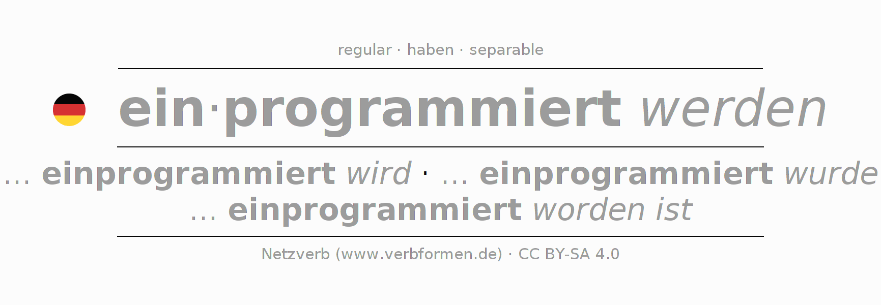 The verb einprogrammieren fully conjugated in all persons and numbers in the Participle Present Perfect