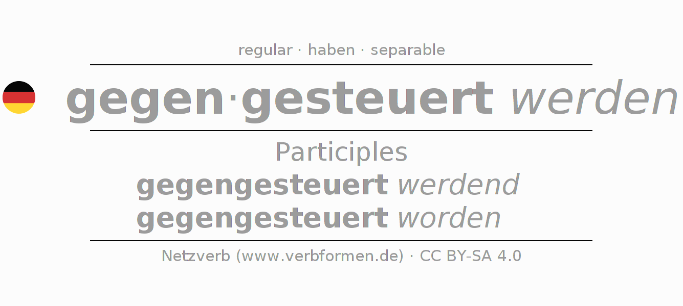 The conjugation of gegensteuern in Participle Present Perfect part of speech Passive is gegengesteuert werdend, gegengesteuert worden.The conjugation corresponds to certain grammatical rules. Likewise the requirements for the conjugation of the simple verb forms of gegensteuern in Participle. Comments ☆