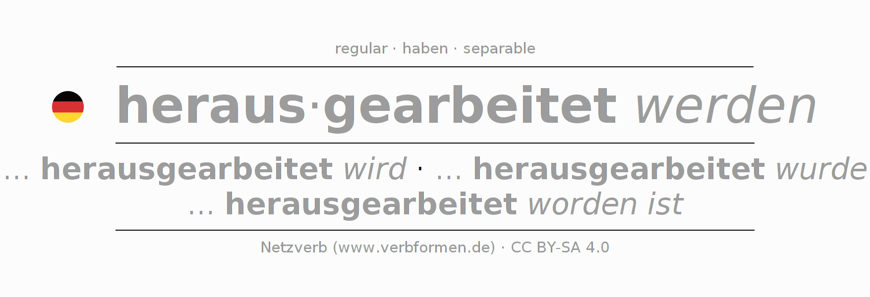 The conjugation of herausarbeiten in Participle Present Perfect part of speech Passive is herausgearbeitet werdend, herausgearbeitet worden.The conjugation corresponds to certain grammatical rules. Likewise the requirements for the conjugation of the simple verb forms of herausarbeiten in Participle. Comments ☆