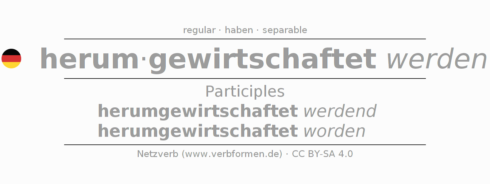 The conjugation of herumwirtschaften in Participle Present Perfect part of speech Passive is herumgewirtschaftet werdend, herumgewirtschaftet worden.The conjugation corresponds to certain grammatical rules. Likewise the requirements for the conjugation of the simple verb forms of herumwirtschaften in Participle. Comments ☆