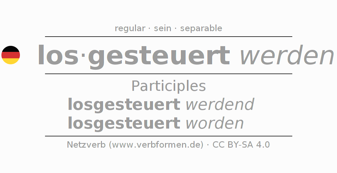 The conjugation of lossteuern in Participle Present Perfect part of speech Passive is losgesteuert werdend, losgesteuert worden.The conjugation corresponds to certain grammatical rules. Likewise the requirements for the conjugation of the simple verb forms of lossteuern in Participle. Comments ☆