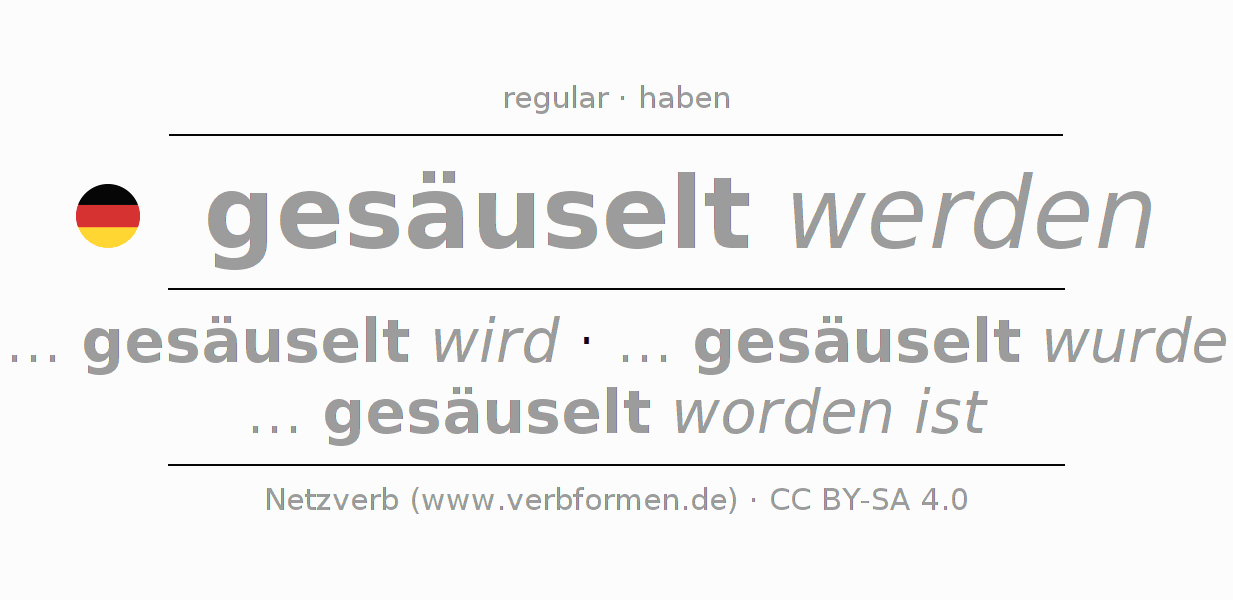 The conjugation of säuseln in Participle Present Perfect part of speech Passive is gesäuselt werdend, gesäuselt worden.The conjugation corresponds to certain grammatical rules. Likewise the requirements for the conjugation of the simple verb forms of säuseln in Participle. Comments ☆