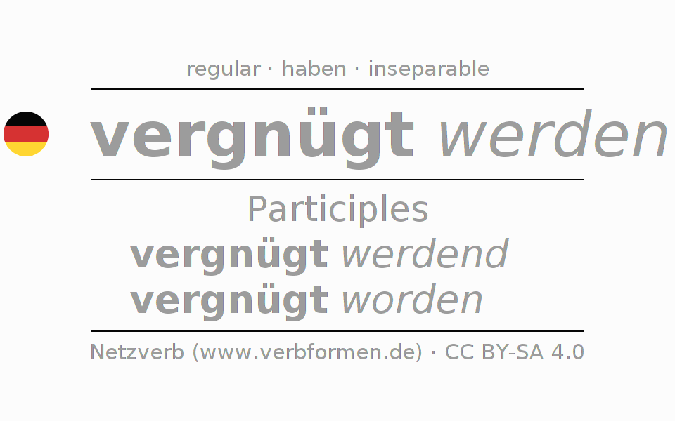 The conjugation of vergnügen in Participle Present Perfect part of speech Passive is vergnügt werdend, vergnügt worden.The conjugation corresponds to certain grammatical rules. Likewise the requirements for the conjugation of the simple verb forms of vergnügen in Participle. Comments ☆