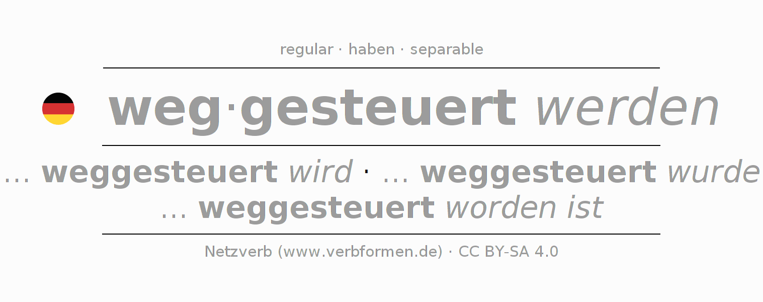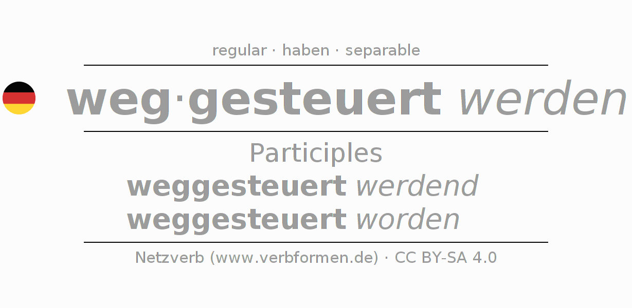 The conjugation of wegsteuern in Participle Present Perfect part of speech Passive is weggesteuert werdend, weggesteuert worden.The conjugation corresponds to certain grammatical rules. Likewise the requirements for the conjugation of the simple verb forms of wegsteuern in Participle. Comments ☆