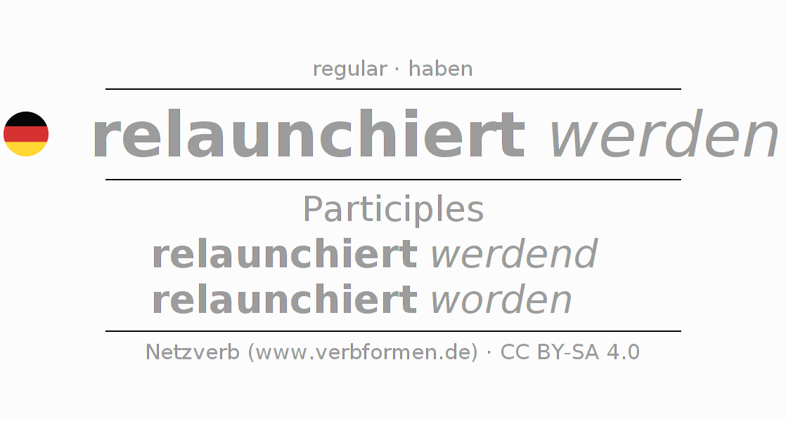 The conjugation of relaunchieren in Participle Present Perfect part of speech Passive is relaunchiert werdend, relaunchiert worden.The conjugation corresponds to certain grammatical rules. Likewise the requirements for the conjugation of the simple verb forms of relaunchieren in Participle. Comments ☆