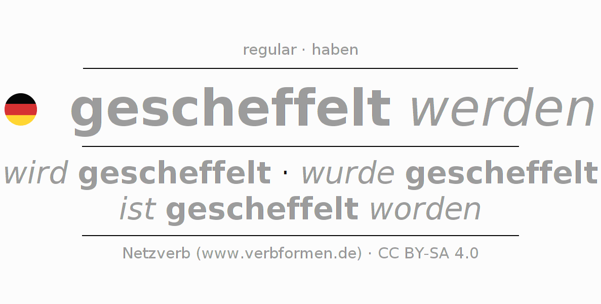 The conjugation of scheffeln in Participle Present Perfect part of speech Passive is gescheffelt werdend, gescheffelt worden.The conjugation corresponds to certain grammatical rules. Likewise the requirements for the conjugation of the simple verb forms of scheffeln in Participle. Comments ☆