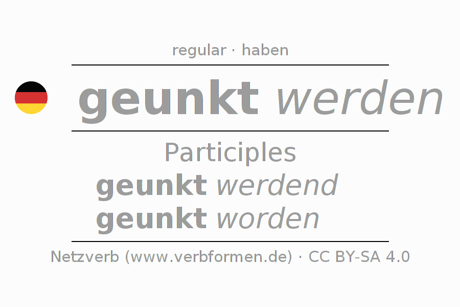 The conjugation of unken in Participle Present Perfect part of speech Passive is geunkt werdend, geunkt worden.The conjugation corresponds to certain grammatical rules. Likewise the requirements for the conjugation of the simple verb forms of unken in Participle. Comments ☆