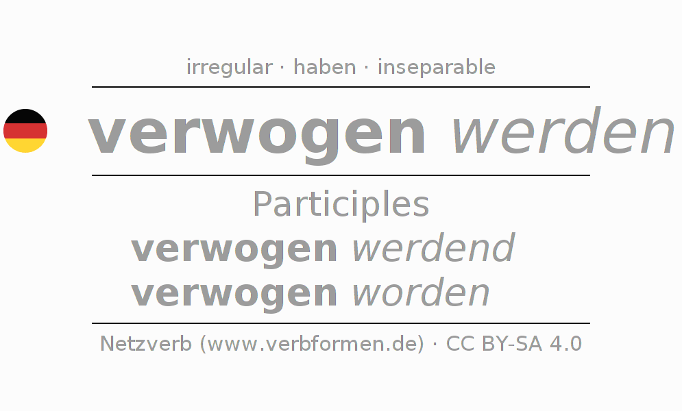 The conjugation of verwiegen in Participle Present Perfect part of speech Passive is verwogen werdend, verwogen worden.The conjugation corresponds to certain grammatical rules. Likewise the requirements for the conjugation of the simple verb forms of verwiegen in Participle. Comments ☆
