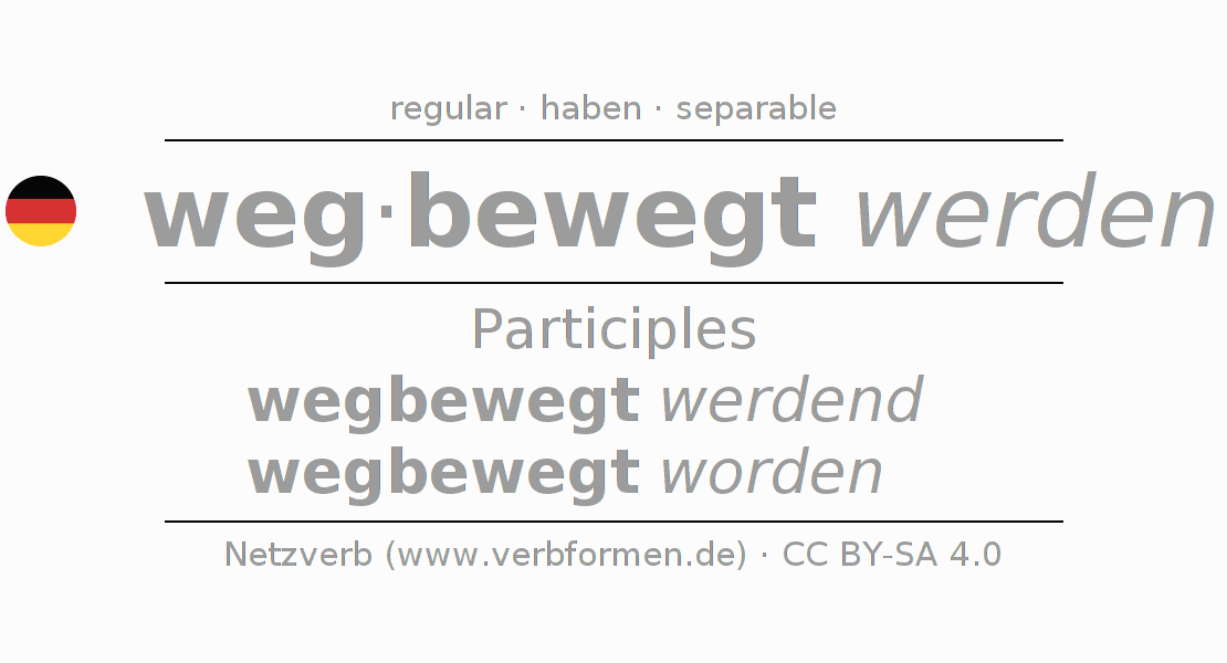 The conjugation of wegbewegen in Participle Present Perfect part of speech Passive is wegbewegt werdend, wegbewegt worden.The conjugation corresponds to certain grammatical rules. Likewise the requirements for the conjugation of the simple verb forms of wegbewegen in Participle. Comments ☆
