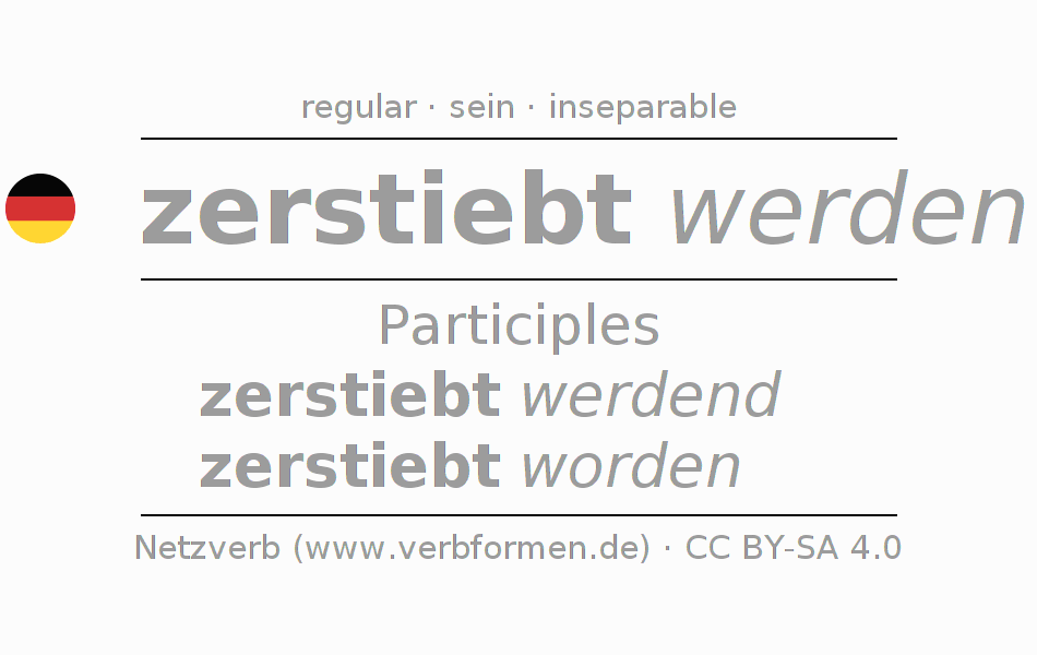 The conjugation of zerstieben in Participle Present Perfect part of speech Passive is zerstiebt werdend, zerstiebt worden.The conjugation corresponds to certain grammatical rules. Likewise the requirements for the conjugation of the simple verb forms of zerstieben in Participle. Comments ☆