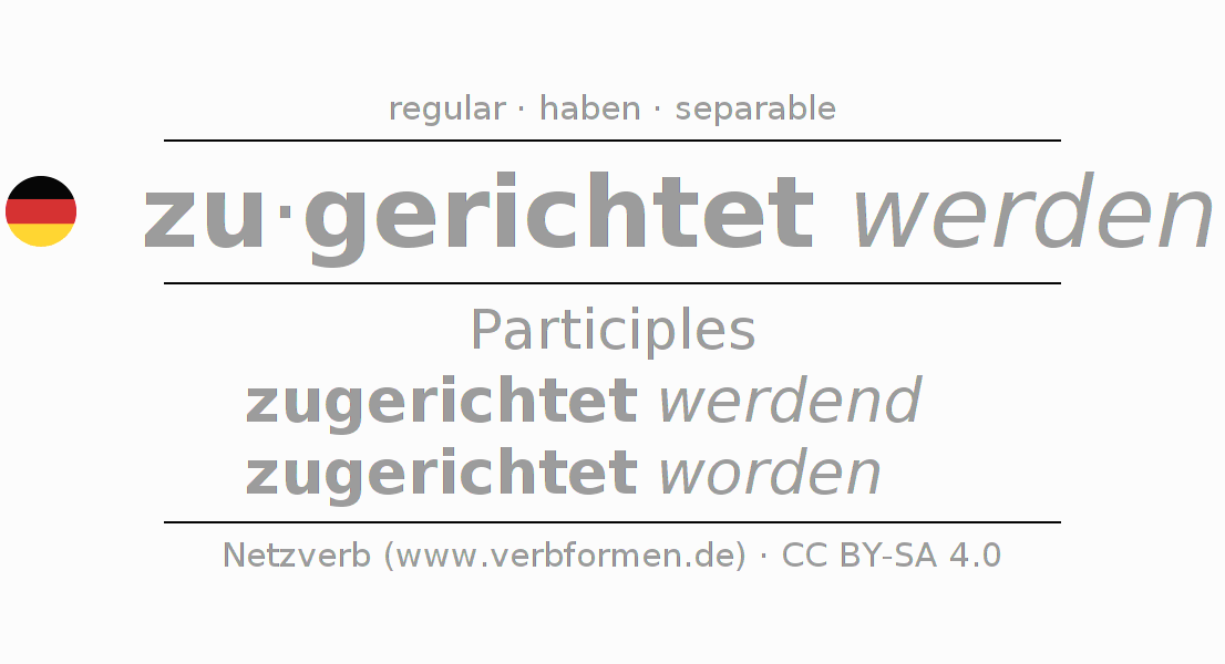 The conjugation of zurichten in Participle Present Perfect part of speech Passive is zugerichtet werdend, zugerichtet worden.The conjugation corresponds to certain grammatical rules. Likewise the requirements for the conjugation of the simple verb forms of zurichten in Participle. Comments ☆