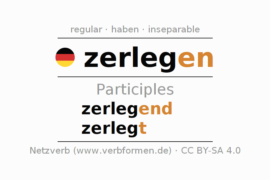 The verb zerlegen fully conjugated in all persons and numbers in the Participle Present Perfect