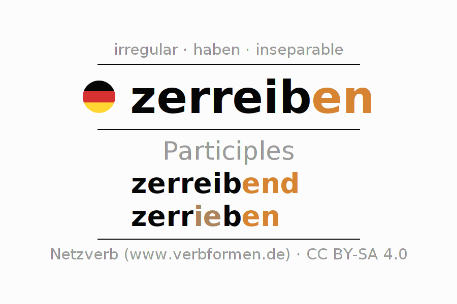 The verb zerreiben fully conjugated in all persons and numbers in the Participle Present Perfect