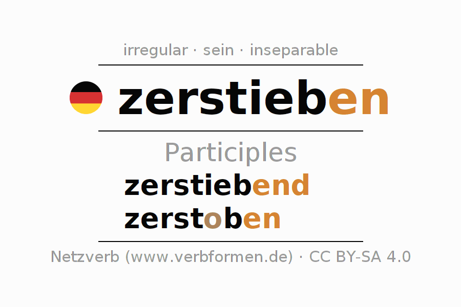 The verb zerstieben (unr) fully conjugated in all persons and numbers in the Participle Present Perfect