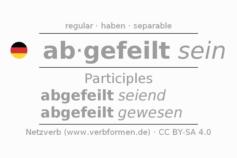 The conjugation of abfeilen in Participle Present Perfect part of speech Statal Passive is abgefeilt seiend, abgefeilt gewesen.The conjugation corresponds to certain grammatical rules. Likewise the requirements for the conjugation of the simple verb forms of abfeilen in Participle. Comments ☆