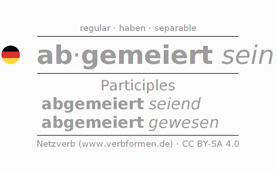 The conjugation of abmeiern in Participle Present Perfect part of speech Statal Passive is abgemeiert seiend, abgemeiert gewesen.The conjugation corresponds to certain grammatical rules. Likewise the requirements for the conjugation of the simple verb forms of abmeiern in Participle. Comments ☆