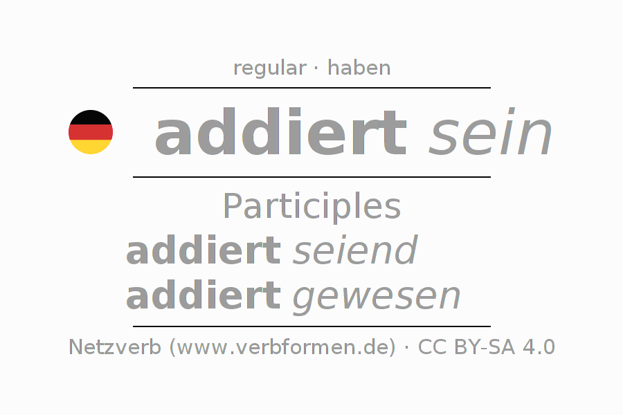 The conjugation of addieren in Participle Present Perfect part of speech Statal Passive is addiert seiend, addiert gewesen.The conjugation corresponds to certain grammatical rules. Likewise the requirements for the conjugation of the simple verb forms of addieren in Participle. Comments ☆